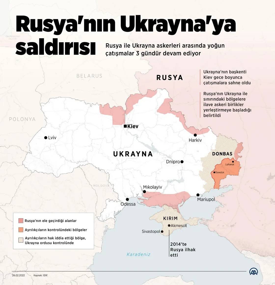 Rusya'nın Ukrayna'ya saldırıları 3. günde de hızla devam ederken Rusya'nın 3 günde aldığı yerler merak ediliyor. Anadolu Ajansı Rusya'nın aldığı yerlerin haritasını paylaştı.