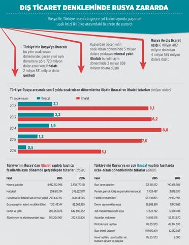 Türkiye İstatistik Kurumu (TÜİK) verilerinden yapılan derlemeye göre, Rusya ile Türkiye arasında geçen yıl kasım ayında yaşanan uçak krizi iki ülke arasındaki ticarete de yansıdı.