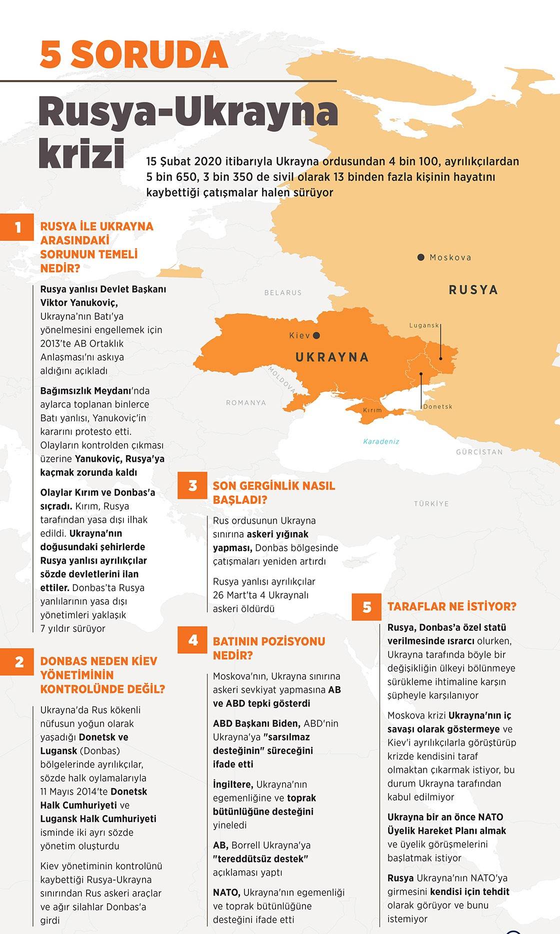 Rusya-Ukrayna krizi neden çıktı? Rusya ile eski bir Sovyetler Birliği ülkesi olan Ukrayna'nın arası, Kiev yönetiminin Avrupa Birliği (AB) ile yakınlaşması üzerine açıldı.