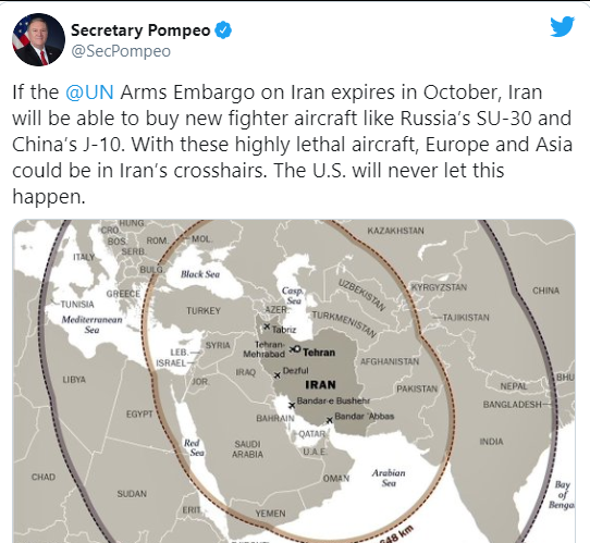 “İran'daki @UN Silah Ambargosu Ekim ayında sona ererse, İran Rusya'nın SU-30 ve Çin'in J-10'u gibi yeni savaş uçakları satın alabilecek. Bu son derece ölümcül uçaklarla Avrupa ve Asya İran'ın çapraz yollarında olabilir. ABD bunun olmasına asla izin vermeyecek” dedi.