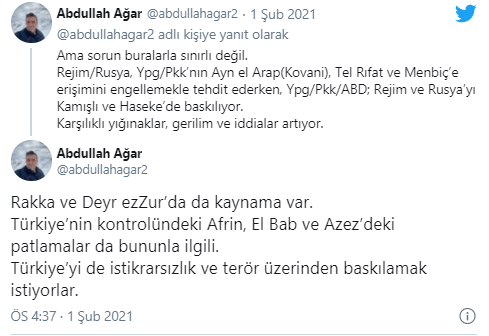 Suriye sahasındaki son durumu değerlendiren Abdullah Ağar ise, "Suriye'de YPG/PYD/ABD ile Rejim/Rusya arasında yaşanan gerilimin kökeninde bizim YPG/PKK'yı vurduğumuz Ayn İsa'nın ve içinden geçen M-4 karayolunun kontrolü, statüsü ve kimin hakimiyetinde olacakları var. Gerilim neden arttı? Ama sorun buralarla sınırlı değil. Rejim/Rusya, YPG/PKK'nın Ayn el Arap (Kobani), Tel Rıfat ve Menbiç'e erişimini engellemekle tehdit ederken, YPG/PKK/ABD; Rejim ve Rusya'yı Kamışlı ve Haseke'de baskılıyor. Karşılıklı yığınaklar, gerilim ve iddialar artıyor. Rakka ve Deyr ezZur'da da kaynama var. Türkiye'nin kontrolündeki Afrin, El Bab ve Azez'deki patlamalar da bununla ilgili. Türkiye'yi de istikrarsızlık ve terör üzerinden baskılamak istiyorlar" dedi.