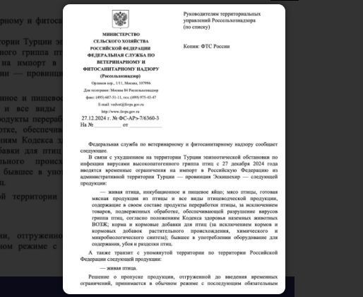 Rusya Federasyonu Tarım Bakanlığı, 27 Aralık 2024 tarihli ve ?P3-7/6360-3 numaralı resmi açıklamasıyla, Türkiye’nin Eskişehir ilinde artan kuş gribi (avian influenza) vakalarına dikkat çekerek, Türkiye'den canlı kümes hayvanı ithalatını durdurduğunu bildirdi.