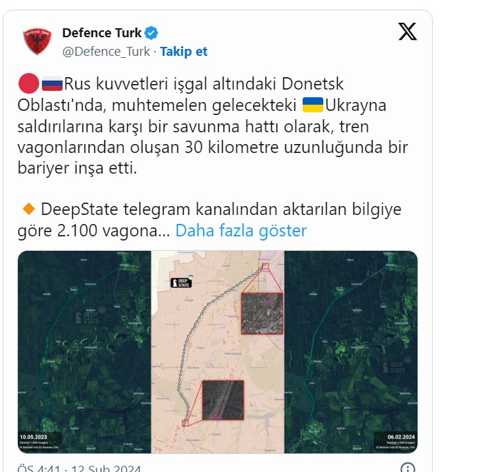 Deepstate, Donetsk bölgesindeki Rus Kuvvetleri tarafından yapılan 30 km tren bariyerinin uydu görüntülerini yayınladı. Uydu görüntüleri tren vagonlarının Donetsk şehrinin güneyindeki Olenivka’dan Mariupol’un kuzeyindeki Volnovakha’ya kadar uzandığını gösteriyor.