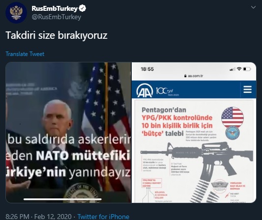 İdlib’te verilen şehitlerden sonra Türkiye ile Rusya arasında soğuk rüzgarlar eserken Türkiye’de bulunan Rus büyükelçiliğinden dikkat çeken bir paylaşım geldi. Rus büyükelçiliği ABD’nin terör örgütüne verdiği desteği hatırlatarak ‘Takdiri size bırakıyoruz’ dedi.