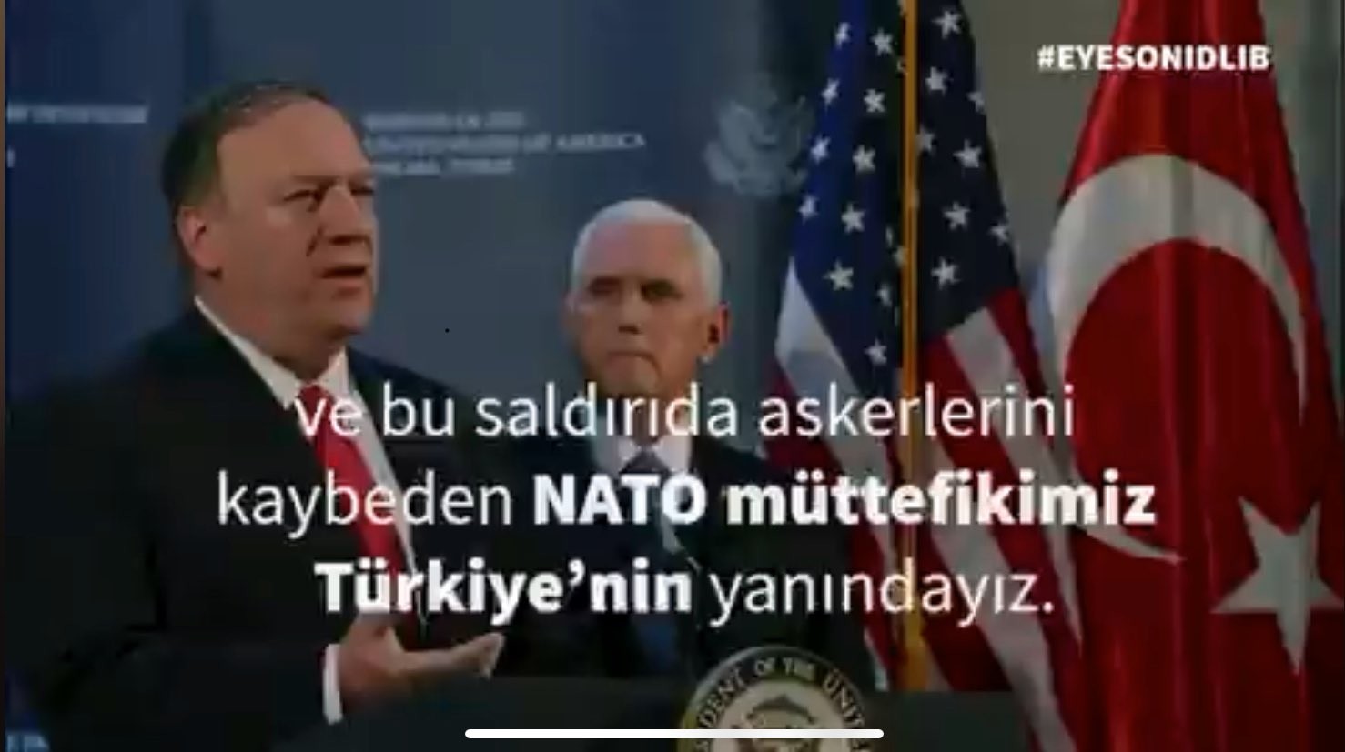 Büyükelçiliğin Türkçe hesabından yapılan paylaşımda ABD Dışişleri Bakanı Mike Pompeo’nun, “NATO müttefikimiz Türkiye’nin yanındayız” ifadelerinin yazılı olduğu bir görseli ekledi.
