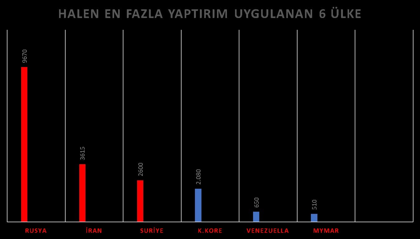Diğer taraftan Türkiye açısından, halen yaptırım uygulanan ülkeler değerlendirildiğinde, dünyada en fazla yaptırım uygulanan 6 ülkeden 3’ü ile komşu olduğu görülür. Kaldı ki bu 3 ülkeye uygulanan yaptırımların miktarı diğerlerinin çok çok üzerindedir.