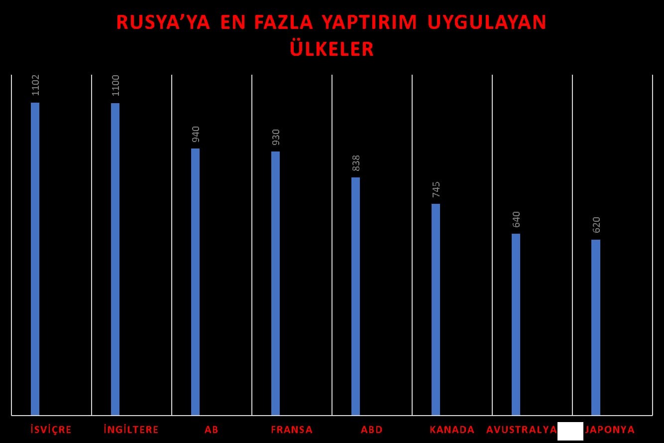 "Halen Ukrayna’yı işgal girişimi sonrası Rusya’ya da yoğun yaptırımlar uygulanmaktadır ve yaptırım uygulanan alanların sayısı giderek artmaktadır. Yaptırımlarda İsviçre (1103) ve İngiltere (1098) başı çekmektedir. Ardından AB (940) ve ABD (838) gelmektedir. Kanada, Avustralya ve Japonya en fazla alanlarda yaptırım uygulayan diğer ülkelerdir. Avustralya’nın İngiltere ile birlikte hareket ettiği, Fransa’nın ise AB’den ayrı kendi belirlediği alanlarda da yaptırım uyguladığı görülmektedir. Yaptırım sisteminin denetimini ise yine bu ülkeler yapıyor. Zaten kurgulanan sistem kendi derin denetim sistemini de oluşturmuş durumda.