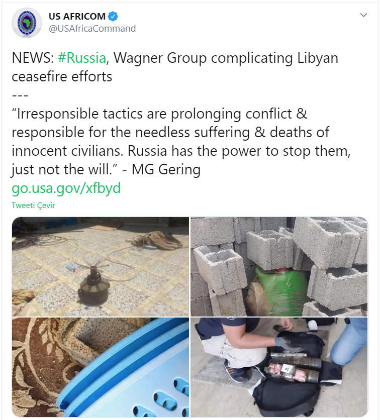 Trablus'taki bir yerleşim bölgesinde bulunduğunu belirttiği el yapımı patlayıcıların fotoğraflarını da Twitter hesabı üzerinden yayınlayan AFRICOM, operasyonlar direktörü Tümamiral Bradford Gering'e atıfla "Wagner Grubu'nun sorumsuz taktikleri, çatışmaları uzatıyor. Bu taktikler aynı zamanda, gereksiz acılardan ve masum sivillerin ölümünden sorumludur. Rusya'nın onları durduracak gücü var, sadece iradesi yok" ifadesini kullandı.