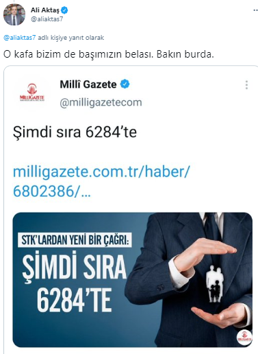 İstanbul Sözleşmesi'ni destekleyen Ali Aktaş, Saadet Partisi'nin yayın organı Milli Gazete'ye dil uzattı. Milli Gazete'nin aile değerlerine saldırıların yasal dayanağı olan 6284 numaralı kanunun kaldırılmasına yönelik yapılan çağrısını eleştirdi. Aktaş, Milli Gazete'nin söz konusu haberini alıntılayarak, "O kafa bizim de başımızın belası. Bakın burada." ifadelerini kullandı.