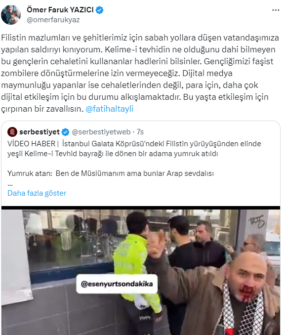 Kelime-i Tevhid yazılı bayrağı taşıyan adama saldırılmasına ve sonrasında saldırgana verilen desteğe bir tepki de Saadet Partisi İstanbul İl Başkanı Ömer Faruk Yazıcı'dan geldi.