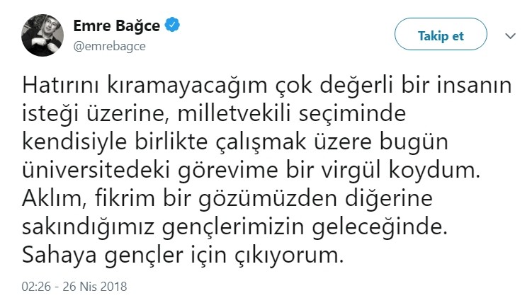 Bağce adaylığıyla ilgili yaptığı açıklamada, "Hatırını kıramayacağım çok değerli bir insanın isteği üzerine, milletvekili seçiminde kendisiyle birlikte çalışmak üzere bugün üniversitedeki görevime bir virgül koydum. Aklım, fikrim bir gözümüzden diğerine sakındığımız gençlerimizin geleceğinde. Sahaya gençler için çıkıyorum" ifadelerini kullandı.