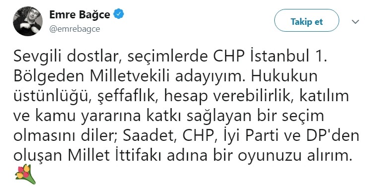 Temel Karamollaoğlu'nun da danışmanı olduğu iddia edilen Emre Bağce, sosyal medya hesabından yaptığı açıklamada "Sevgili dostlar, seçimlerde CHP İstanbul 1. Bölgeden Milletvekili adayıyım. Hukukun üstünlüğü, şeffaflık, hesap verebilirlik, katılım ve kamu yararına katkı sağlayan bir seçim olmasını diler; Saadet, CHP, İyi Parti ve DP'den oluşan Millet İttifakı adına bir oyunuzu alırım." ifadesinde bulundu.