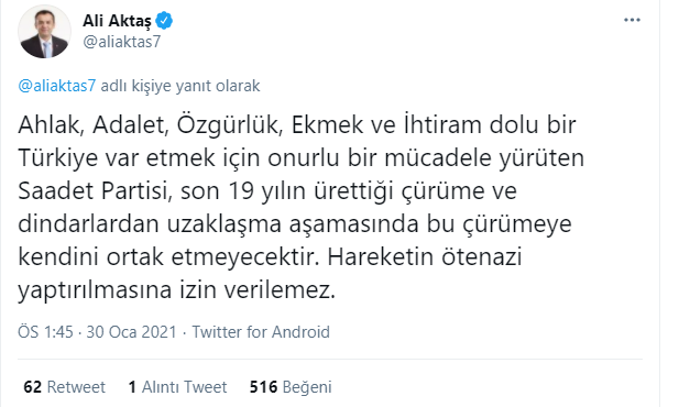 Öte yandan Saadet Partili Ali Aktaş da twitter hesabından paylaşımlarda bulunmaya devam etti. Aktaş bugünkü paylaşımında, "Ahlak, adalet, özgürlük, ekmek ve ihtiram dolu bir Türkiye var etmek için onurlu bir mücadele yürüten Saadet Partisi, son 19 yılın ürettiği çürüme ve dindarlardan uzaklaşma aşamasında bu çürümeye kendini ortak etmeyecektir. Hareketin ötenazi yaptırılmasına izin verilemez." dedi.