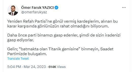 Yeniden Refah Partisi Genel Başkanı Dr. Fatih Erbakan'ın Cumhur İttifakı'na katılma kararını açıklamasından sonra Twitter hesabından paylaşımda bulunan Saadet Partisi İstanbul İl Başkanı Ömer Faruk Yazıcı, Yeniden Refah tabanına fitne tohumu ekmeye çalıştı.