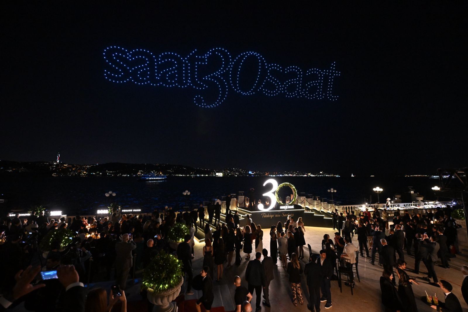 Eğlencenin doruk noktasında Saat&Saat; 30. yılına özel, yüzlerce drone ile gerçekleştirilen sanatsal bir görsel şova imza attı. Drone’ların aynı anda gökyüzüne yayılmasıyla başlayan sanatsal kurguda saat çarkları, akrep-yelkovan gibi detaylarıyla oluşturulan dev saat görseli, dünyaca ünlü markaların logoları eşliğinde Boğaz'ı aydınlattı. Çırağan Sarayı’nda bir ilk olan bu sanatsal drone gösterisi hem davetlilere ve hem de Boğaz’dan geçenlere unutulmaz anlar yaşattı.
