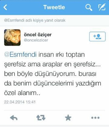 Öziçer, Twitter'da yayınladığı mesajında, "İnsan ırkı toptan şerefsiz ama Araplar en şerefsiz" ifadelerini kullandı.