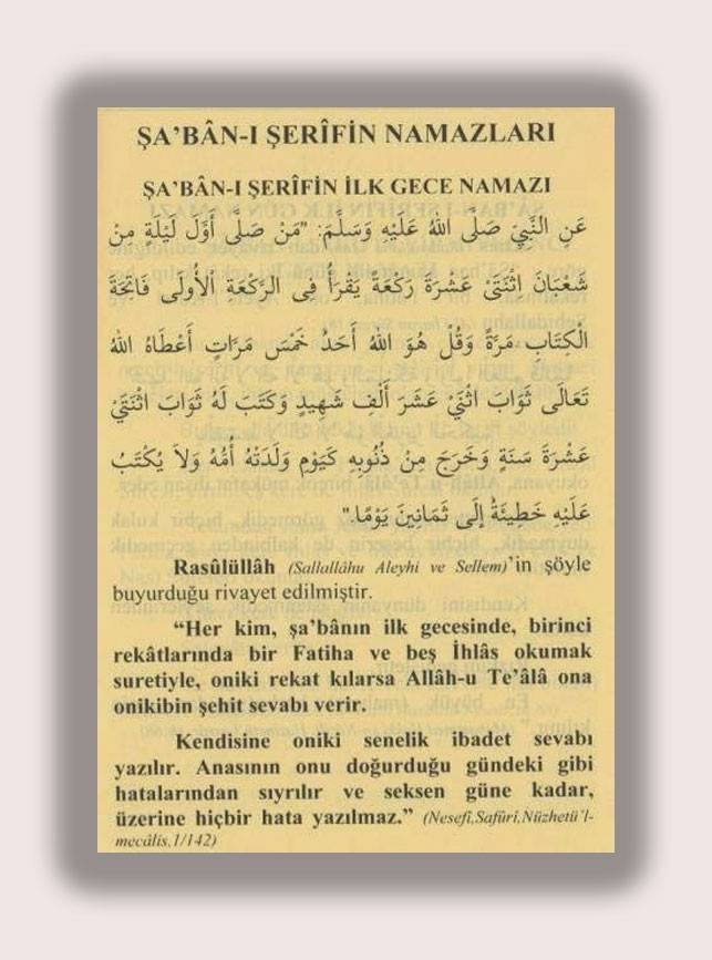 1-) Nesefi (Rahimehullah) 'ın nakline göre; her kim Şaban'ın ilk gecesinde, birinci rekatlarında 1 Fatiha ve 5 İhlas (bazı rivayetlerde her rekatta 15 İhlas) suresi okumak suretiyle 12 rekat kılarsa, Allahu Te'ala ona 12 bin şehid sevabı verir. Kendisine 12 senelik ibadet sevabı yazılır. Anasının doğurduğu gündeki gibi hatalarından sıyrılır ve 80 güne kadar üzerine hiçbir hata yazılmaz.