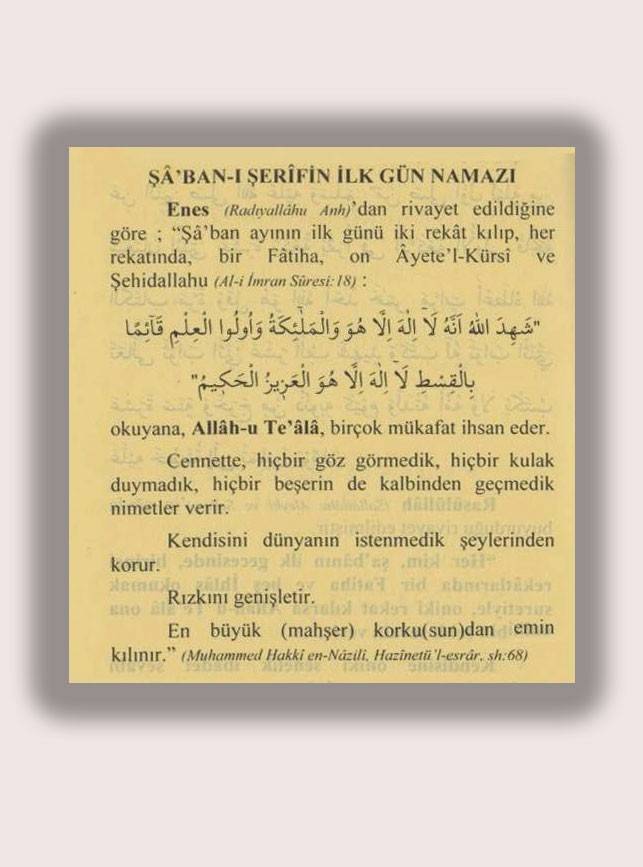 2-) Muhammed ibni Hatiruddin Hazretleri'nin nakline göre; Şabanı Şerif ayının ilk gecesi 12 rekat kılınır, her rekatta Fatiha'dan sonra 15 kere İhlas Suresi okunur, Her kim bunu yaparsa onun amel defterine 10.000 hasene sevap yazılır ve 10.000 günahı olsa da silinir.