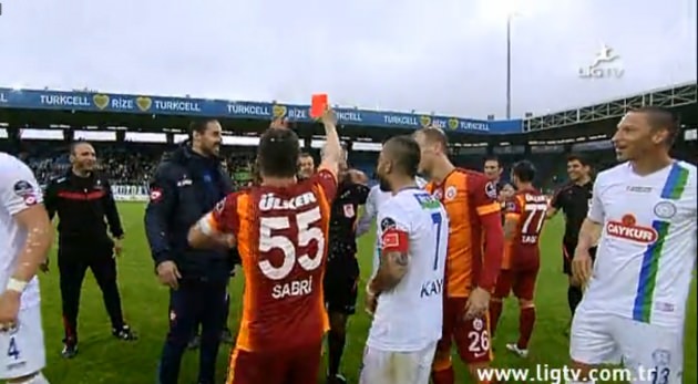 Galatasaray'ın tartışılan kaptanı Sabri Sarıoğlu Rizespor maçından sonra hakem Mustafa Kamil Abitoğlu'na kırmızı kart göstermişti. Ancak bu maç Abitoğlu'nun veda maçıydı ve Sabri, Abitoğlu'nun yeşil sahalardan tamamen atmıştı. İşin şakası bir yana yeşil sahalarda hakemin elinden kartı alıp ona gösteren futbolcular sadece Salih Dursun'la sınırlı değil...