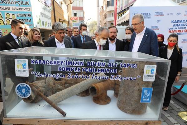 Bursa’nın 17 ilçesiyle birlikte sağlıklı bir geleceğe hazırlanması için altyapı yatırımlarını aralıksız sürdüren Bursa Büyükşehir Belediyesi, Karacabey ilçesinin altyapısı da sil baştan yeniliyor. Avrupa Yatırım Bankası kredisiyle yapımına başlanan ve Karacabey İlçesi’ndeki 226 kilometrelik içme suyu hattının tamamen yenileceği projede imalatlar hızla devam ediyor. Çalışmalarda fiziki gerçekleşme yüzde 60 seviyelerine ulaşırken, Karacabey Belediyesi yer altından çıkan 50 yıllık eski içme suyu hatlarında kullanılan sağlıksız boruları vatandaşlara sergiliyor. Bursa Büyükşehir Belediye Başkanı Alinur Aktaş beraberindeki Karacabey Belediye Başkanı Ali Özkan ve Bursa Milletvekili Mustafa Esgin ile sergilenen eski boruları inceleyip, yapılan çalışmanın ne kadar hayati önem taşıdığını vurguladı.