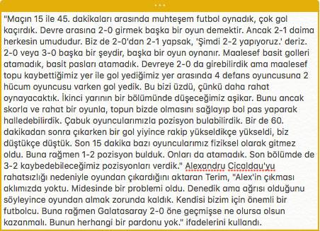 Galatasaray Teknik Direktörü Fatih Terim, Kasımpaşa ile 2-0 öndeyken 2-2 berabere kalmalarının bir "Pardon"u olmadığını belirtti. Karşılaşmanın kırılma anının ilk yarının uzatma dakikalarında yedikleri gol olduğunu aktaran Terim, maç değerlendirmesiyle ilgili şunları kaydetti: