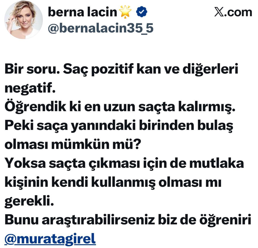 Sosyal medya hesabından yaptığı paylaşımda "Bir soru. Saç pozitif kan ve diğerleri negatif. Öğrendik ki en uzun saçta kalırmış. Peki saça yanındaki birinden bulaş olması mümkün mü? Yoksa saçta çıkması için de mutlaka kişinin kendi kullanmış olması mı gerekli. Bunu araştırabilirseniz biz de öğreniriz" ifadelerini kullanan Laçin beyin yaktı.