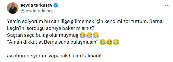 Berna Laçin'in cehaletini alıntılayan Sevda Türküsev "Yemin ediyorum bu cahilliğe gülmemek için kendimi zor tuttum" ifadelerini kullandı.