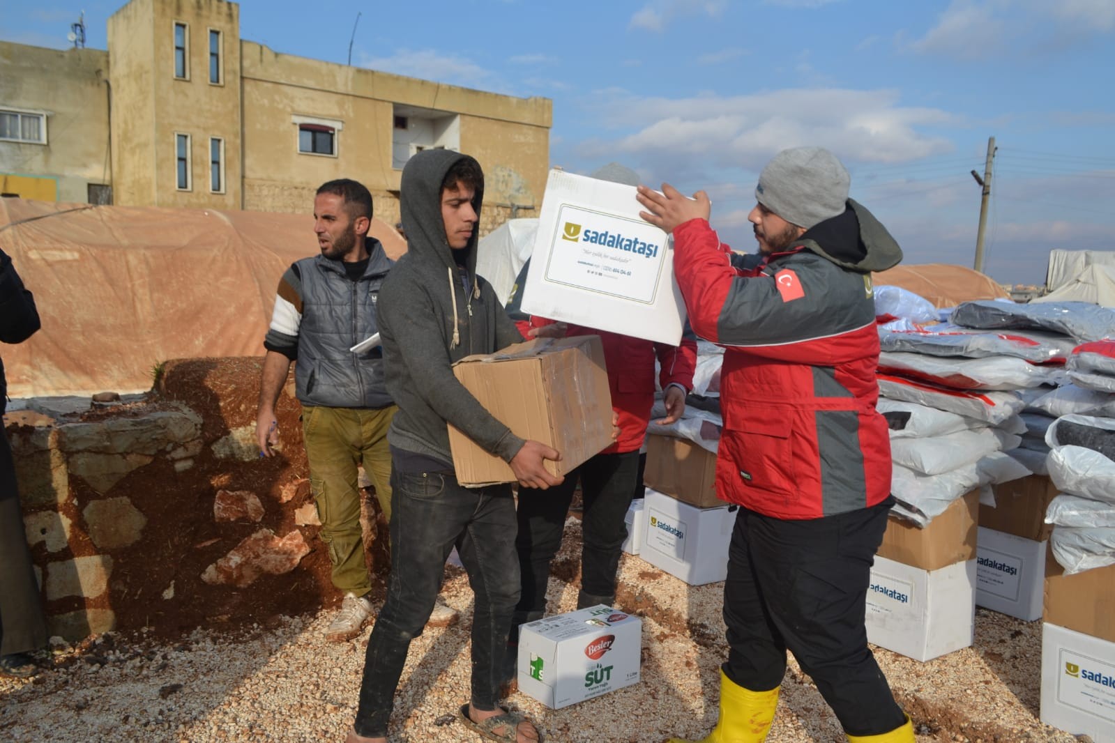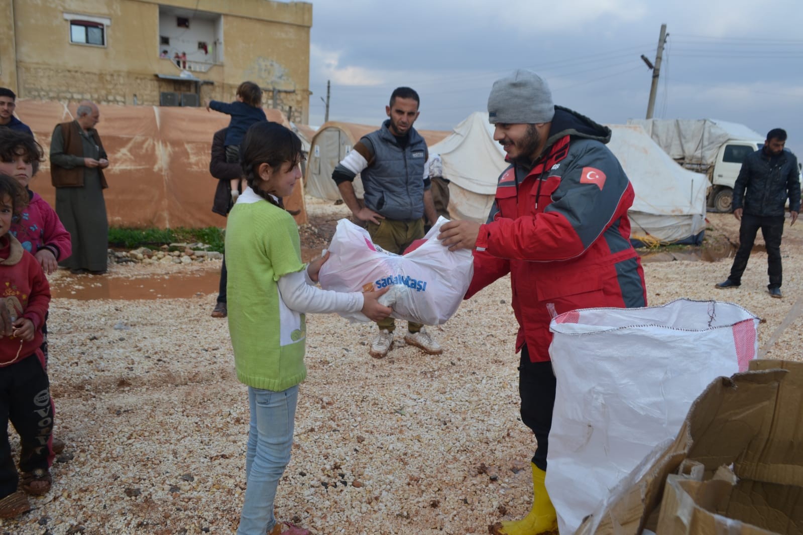 Bölgede bulunan Sadakataşı acil yardım ekibi kamplarda yaşayan 100 aileyeikişer paket çocuk bezi ile bebek bisküvisi, ıslak mendil ve şampuandan oluşan çocuk paketi dağıttı. Ayrıca bir ton süt mülteci ailelere ulaştırıldı.