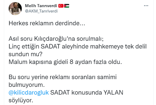 Twitter hesabından paylaşımda bulunan Tanrıverdi, "Herkes reklamın derdinde." dedikten sonra, Kılıçdaroğlu'nun SADAT iftirasına dikkat çekip, "Mahkemeye tek delil sundun mu?" diye sordu.