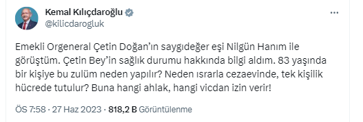 Mesajına, "Emekli Orgeneral Çetin Doğan’ın saygıdeğer eşi Nilgün Hanım ile görüştüm. Çetin Bey’in sağlık durumu hakkında bilgi aldım." diyerek başlayan Kılıçdaroğlu, "83 yaşında bir kişiye bu zulüm neden yapılır? Neden ısrarla cezaevinde, tek kişilik hücrede tutulur? Buna hangi ahlak, hangi vicdan izin verir!" ifadelerini kullandı.