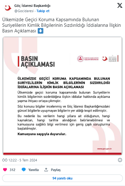 İçişleri Bakanlığı: "Sosyal medya hesabının yöneticisinin 14 yaşındaki E.P. olduğu tespit edilmiştir. Hesaptan Geçici Koruma Altındaki Suriyelilerin kimlik bilgilerinin paylaşıldığı anlaşılmıştır." Dedi. Göç İdaresi ise "Bilgilerin, güncel verilerle uyuşmadığı tespit edilmiştir. Verilerin hangi tarihte alındığının tespiti için geniş çaplı soruşturma başlatılmıştır." Diye açıklama yapınca akıllara Ümit Özdağ’ın bir TV kanalında yaptığı konuşmalar geldi.