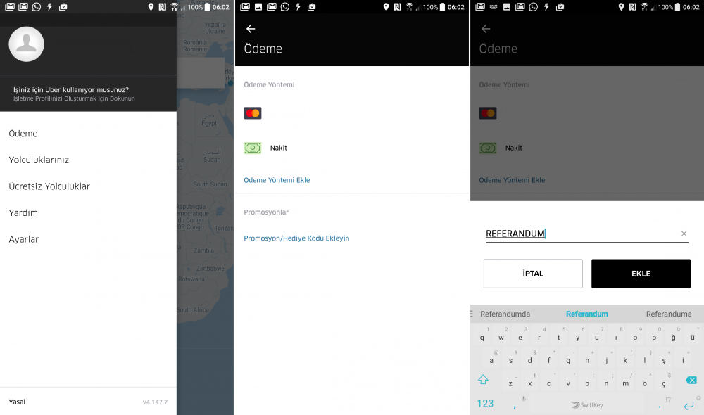 Firma, tüm Uber kullanıcılarına 05:00 - 23:59 saat aralığında 30 TL’yi geçmeyecek şekilde gün içinde iki defa taşıma hakkı tanıyacak. UberXL araçlarını çağırmak için ise kullanıcılar, ödeme kısmına 'Promosyon Ekle' seçeneğinden 'REFERANDUM' kodunu eklemeleri gerekecek. Bu işlemi tamamladıktan sonra Uber kullanıcıları sandık başına ücretsiz bir şekilde ulaşım sağlayabilecek.
