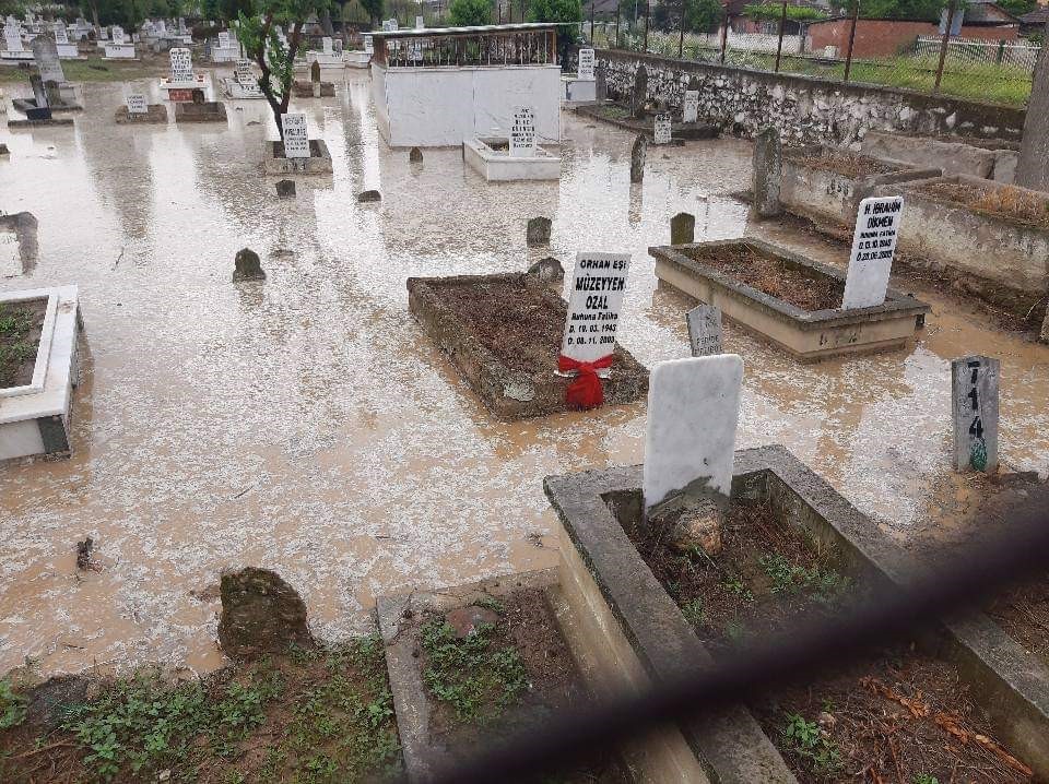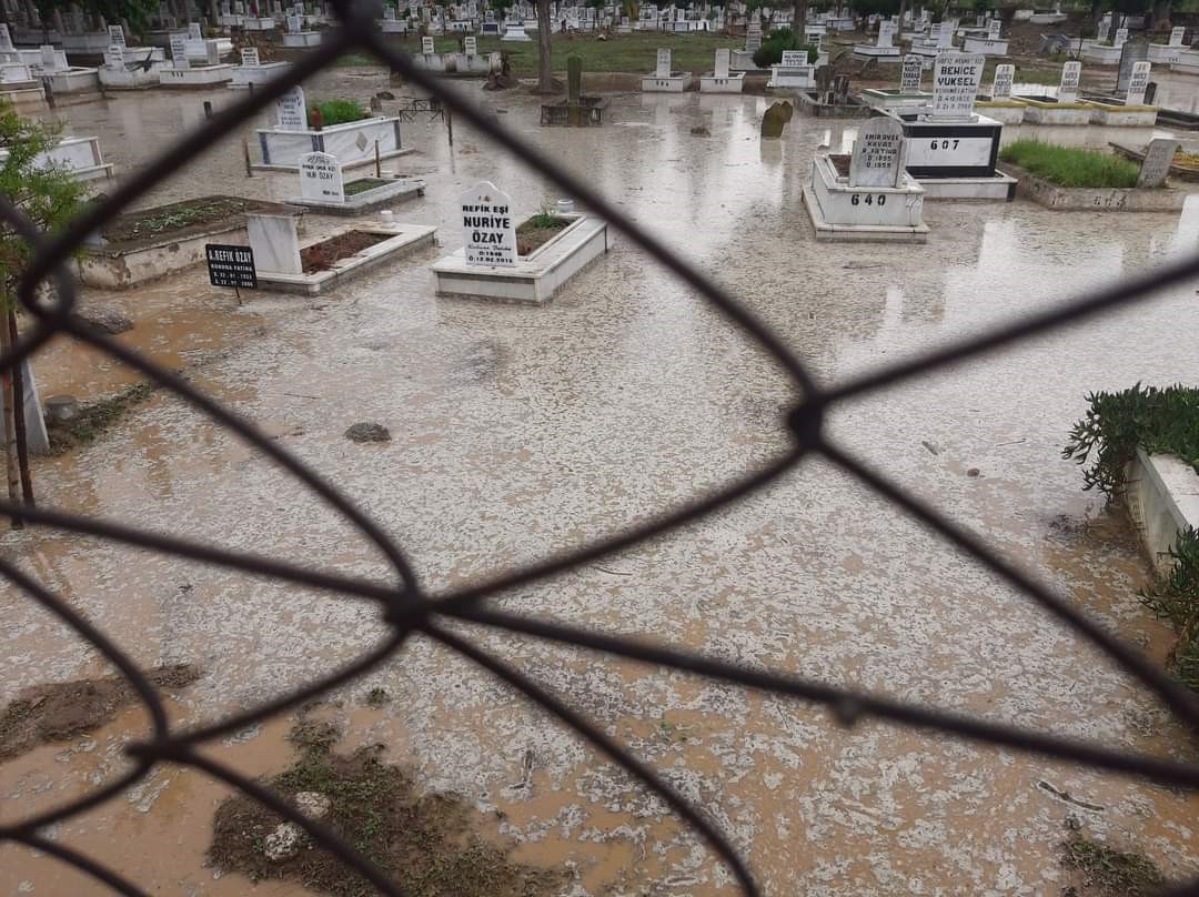 Aydın'n Efeler ilçesinde etkili olan sağanak yağış Umurlu Mahallesi'nde bulunan mezarlığı su içerisinde bırakırken vatandaşlar duruma çare bulunmasını istedi.