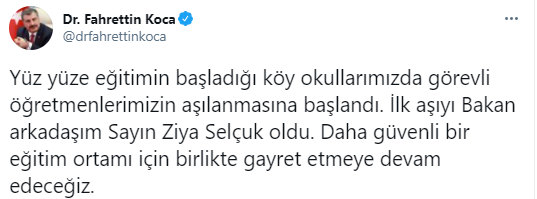 Bakan Ziya Selçuk'un aşı olduğunu duyuran Sağlık Bakanı Koca Fahrettin Koca "Yüz yüze eğitimin başladığı köy okullarımızda görevli öğretmenlerimizin aşılanmasına başlandı." dedi.