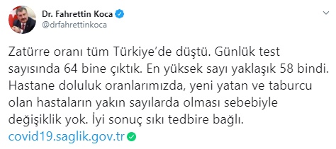 Sağlık Bakanı Fahrettin Koca son verilere ilişkin yaptığı açıklamada, "Zatürre oranı tüm Türkiye’de düştü. Günlük test sayısında 64 bine çıktık. En yüksek sayı yaklaşık 58 bindi. Hastane doluluk oranlarımızda, yeni yatan ve taburcu olan hastaların yakın sayılarda olması sebebiyle değişiklik yok. İyi sonuç sıkı tedbire bağlı" ifadelerini kullandı.