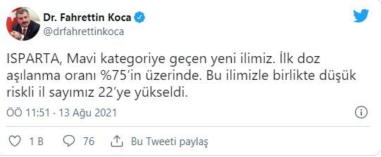 Sağlık Bakanı Fahrettin Koca, sosyal medya üzerinden koronavirüs ile mücadele kritik bilgileri paylaşmaya devam ediyor. Bakan Koca bir ilin daha mavi kategoriye geçtiğini duyurdu.