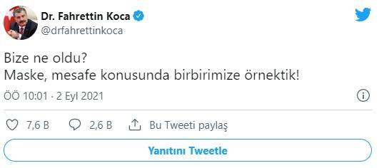 Sağlık Bakanı Fahrettin Koca, sosyal medya hesabından maske ve mesafeye yönelik dikkat çeken bir paylaşımda bulundu. Koca, "Bize ne oldu? Maske, mesafe konusunda birbirimize örnektik!" diye sordu.