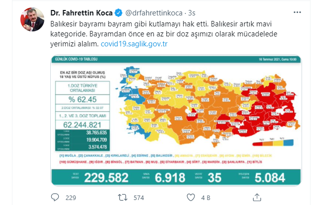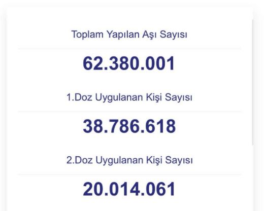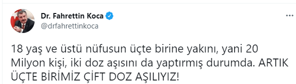 Twitter hesabından paylaşımda bulunan Sağlık Bakanı Fahrettin Koca, aşılama müjdesini, "Artık üçte birimiz çift doz aşılıyız." diyerek duyurdu. Bakan Koca'nın paylaştığı verilere göre, ülkemizde yapılan toplam aşı sayısı 62 milyon 380 bin 1 kişiye ulaştı. 38 milyon 786 bin 618 kişiye birinci doz aşısı yapılırken, ikinci doz aşı uygulanan kişi sayısı 20 milyon 60 bin 14 bin 61 kişi oldu.