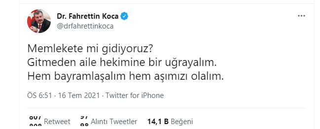 Bayram tatilinin başlaması ile birlikte aşılanma çağrısını yineleyen Sağlık Bakanı Fahrettin Koca, "Memlekete mi gidiyoruz? Gitmeden aile hekimine bir uğrayalım. Hem bayramlaşalım hem aşımızı olalım." ifadelerini kullandı.