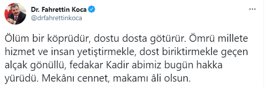 Sağlık Bakanı Fahrettin Koca, "Ömrü millete hizmet ve insan yetiştirmekle, dost biriktirmekle geçen alçak gönüllü, fedakar Kadir abimiz bugün hakka yürüdü. Mekanı cennet, makamı âli olsun" dedi