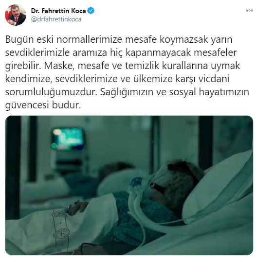 Sağlık Bakanı Fahrettin Koca Twitter hesabından yaptığı paylaşımda, “Bugün eski normallerimize mesafe koymazsak yarın sevdiklerimizle aramıza hiç kapanmayacak mesafeler girebilir. Maske, mesafe ve temizlik kurallarına uymak kendimize, sevdiklerimize ve ülkemize karşı vicdani sorumluluğumuzdur. Sağlığımızın ve sosyal hayatımızın güvencesi budur” ifadelerini kullandı.