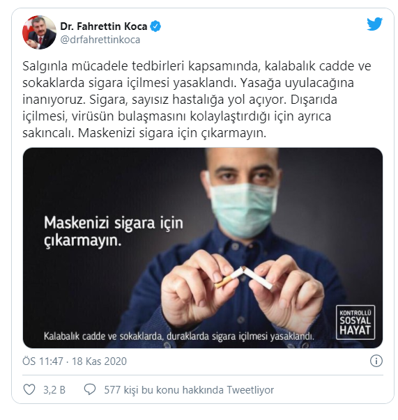 Sağlık Bakanı Fahrettin Koca, yeni tip koronavirüs (Kovid-19) salgınıyla mücadele tedbirleri kapsamında kalabalık cadde ve sokaklarda sigara içilmesinin yasaklanmasına ilişkin Twitter hesabından paylaşımda bulundu.