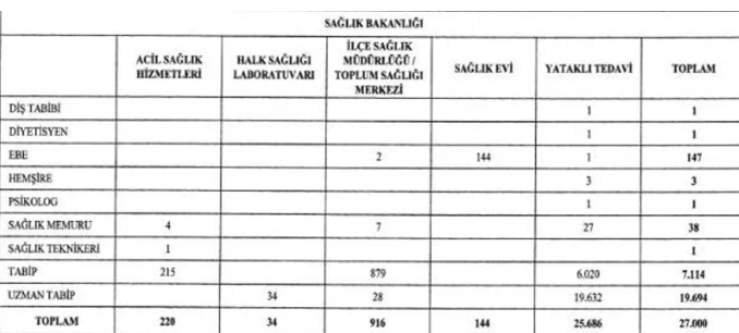 27 bin sağlık personeli atama branş ve kontenjan dağılımı 2022! Sağlık Bakanlığı 27 bin personel alım branş listesi... Sağlık Bakanlığı tarafından 27 bin sözleşmeli personel alımına ilişkin karar Resmi Gazete’de yayımlandı. Cumhurbaşkanı Recep Tayyip Erdoğan’ın imzasıyla yayımlanan Cumhurbaşkanı Kararı’na göre Sağlık Bakanlığı 27 bin personel alımı yapacak. Sağlık sektöründe eleman temininde güçlük çekilen yerlerde ve hizmet dallarında hizmetlerinin etkili ve verimli bir şekilde yürütülebilmesi amacıyla 2022 yılının sonuna kadar uygulanmak üzere istihdam edilecek sözleşmeli sağlık personeli sayısı 27 bin olarak tespit edildi.