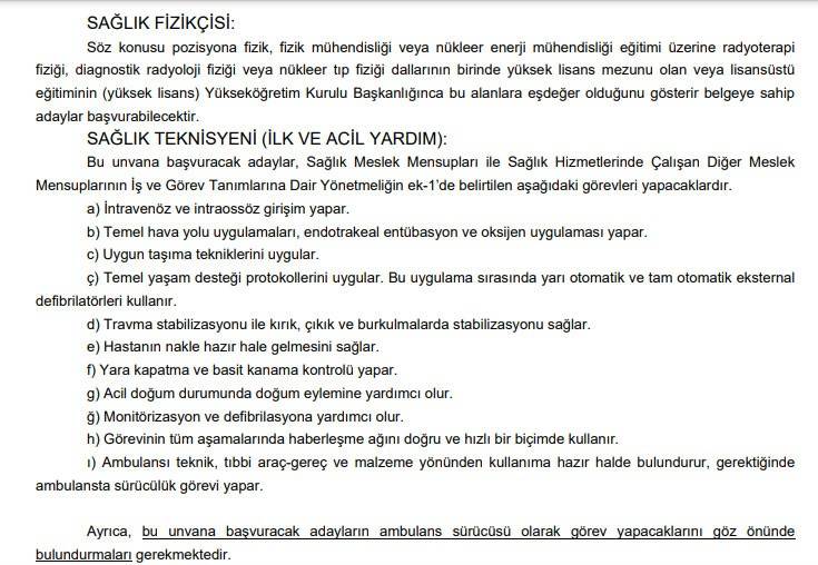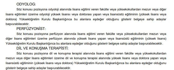 Atama yapılacak sözleşmeli pozisyonların unvan, branş, sayı ve öğrenim düzeylerine göre dağılımları şöyle: "Biyolog 6 (lisans), çocuk gelişimcisi 96 (lisans), dil ve konuşma terapisti 50 (lisans), diyetisyen 338 (lisans), ebe 1600 (lisans), fizyoterapist 390 (lisans), hemşire 8794 (lisans), hemşire 1554 (ortaöğretim), iş ve uğraşı terapisti (ergoterapist) 46 (lisans), odyolog 50 (lisans), perfüzyonist 14 (lisans), psikolog 287 (lisans), sağlık fizikçisi 27 (lisans), sağlık teknikeri - adli tıp 23 (ön lisans), sağlık teknikeri - ağız ve diş sağlığı 220 (ön lisans), sağlık teknikeri - ameliyat 66 (ön lisans), sağlık teknikeri - anestezi 1107 (ön lisans), sağlık teknikeri - çevre sağlığı 66 (ön lisans), sağlık teknikeri - diş protez 66 (ön lisans), sağlık teknikeri - diyaliz 172 (ön lisans), sağlık teknikeri - eczane 122 (ön lisans), sağlık teknikeri - elektronörofizyoloji 39 (ön lisans), sağlık teknikeri - evde bakım 98 (ön lisans), sağlık teknikeri - fizik tedavi 137 (ön lisans), sağlık teknikeri - ilk ve acil yardım 1194 (ön lisans), sağlık teknikeri - iş ve uğraşı terapisi 22 (ön lisans), sağlık teknikeri - laboratuvar 513 (ön lisans), sağlık teknikeri - odyometri 112 (ön lisans), sağlık teknikeri - ortopedi 130 (ön lisans), sağlık teknikeri - patolojik anatomi 27 (ön lisans), sağlık teknikeri - podolog 20 (ön lisans), sağlık teknikeri - radyoterapi 40 (ön lisans), sağlık teknikeri - röntgen 706 (ön lisans), sağlık teknikeri - tıbbi sekreter 1466 (ön lisans), sağlık teknikeri - yaşlı bakım teknikeri 10 (ön lisans), sağlık teknisyeni - anestezi 43 (ortaöğretim), sağlık teknisyeni - çevre sağlığı 10 (ortaöğretim), sağlık teknisyeni - ilk ve acil yardım 66 (ortaöğretim), sağlık teknisyeni - laboratuvar 43 (ortaöğretim), sağlık teknisyeni - röntgen 43 (ortaöğretim), sağlık teknisyeni - tıbbi sekreter 43 (ortaöğretim), sosyal çalışmacı 144 (lisans), toplam 11842 (lisans), 6356 (ön lisans), 1802 (ortaöğretim), genel toplam (20 bin)."