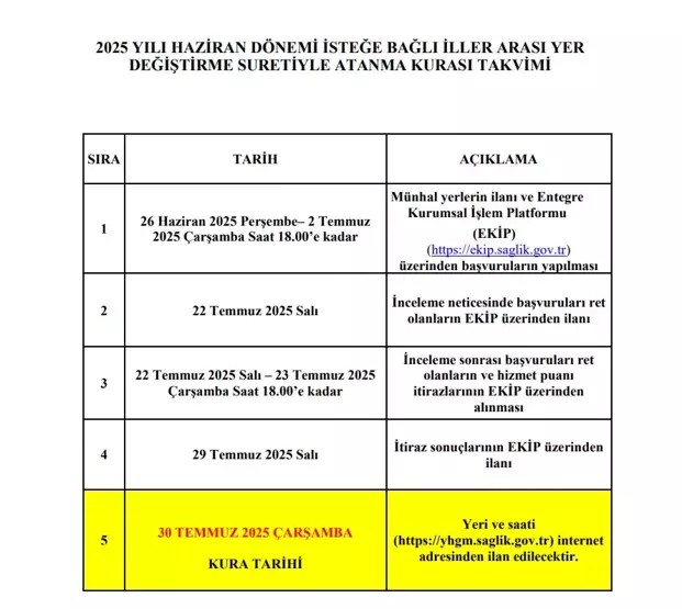Sağlık Bakanlığı Atama ve Yer Değiştirme Yönetmeliği uyarınca, 2025 yılı Haziran dönemi isteğe bağlı iller arası yer değiştirme atama kurası 30 Temmuz 2025, Çarşamba günü noter huzurunda bilgisayar ortamında gerçekleştirilecektir. Başvurular, EKİP (Entegre Kurumsal İşlem Platformu) üzerinden yapılacaktır. Adaylar, belirlenen tarihlerde https://ekip.saglik.gov.tr adresinden giriş yaparak başvuru formunu doldurup tercihlerde bulunabilecekler.
