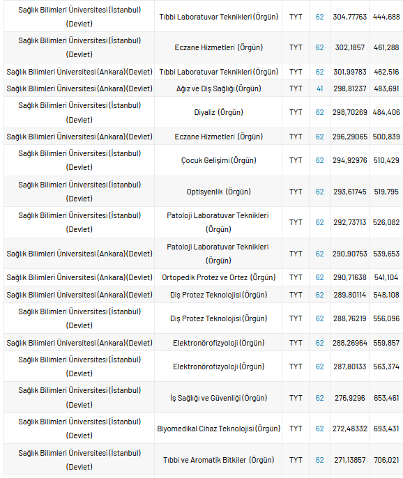 Sağlık Bilimleri Üniversitesi 2 yıllık taban puanları 2021, yüzdelik dilimleri ve kontenjan sayıları kaçtır?