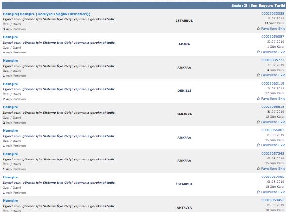 Türkiye İŞ Kurumu (İŞKUR) güncel iş ilanları merak ediliyor. Türkiye’nin en büyük istihdam oluşturma kurumu olan İŞKUR, günde binlerce kişiyi iş sahibi yapıyor. Bundan dolayıda hem kamu kurum ve kuruluşları hem de özel sektör firmaları personel temini için İŞKUR’un kapısını çalmakta. İŞKUR son iş ilanlarına bakıldığında 19 Temmuz 2019 tarihinde yayınlanan açık iş ilanlarına göre Türkiye genelinde çok sayıda sağlık personeli alımı yapılacağı açıklandı. İŞKUR üzerinden alınacak personellin başında sağlıkçılar gelmekte. İŞKUR sağlık personeli alımları için 35 hemşire, 7 acil tıp teknisyeni, 5 ambulans şoförü, anestezi teknikeri ve anestezi teknisyeni kadrolarının olduğu bildirildi. Başvuruda bulunmak isteyen adayların her bir iş ilanında farklı olmak üzere en az ortaöğretim (lise ve dengi okullar) ve ön lisans mezunu olmaları gereklidir. Sağlık hizmetleri personel alımları başta İstanbul, İzmir, Ankara ve Antalya olmak üzere birçok ilde olmaktadır. Başvurular 02 Ağustos 2019 tarihine kadar devam etmektedir. Hemşire alımı iş ilanları, acil tıp teknisyeni iş ilanları, ambulans şoförü iş ilanları, anestezi Teknikeri iş ilanları, anestezi Teknisyeni iş ilanları için İŞKUR üzerinen başvuru yapılmakta.