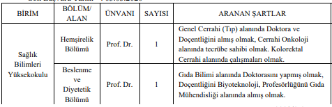 Yayınlanan ilanda şu ifadeler kullanıldı: Üniversitemize 2547 Sayılı Kanun’un İlgili Maddeleri ile Öğretim Üyeliğine Yükseltilme ve Atanma Yönetmeliği’nin ilgili maddeleri uyarınca aşağıdaki tabloda belirtilen Fakülte ve Bölüme/Anabilim Dalı tam zamanlı öğretim üyesi alınacaktır. Profesör kadrosuna başvuracak adayların, dilekçeleri ile birlikte 4 adet vesikalık fotoğraf, YÖK formatlı güncel özgeçmişi, nüfus cüzdanı sureti, askerlik durumunu gösteren belge örneği, Doktora Belgesinin Onaylı örneği, Doçentlik Belgesinin Onaylı örneği, Profesörlük Belgesinin Onaylı örneği, yayın listesi, yüksek lisans ve doktora tezleri, bilimsel çalışma ve yayınları, verdiği dersleri ve yönettiği doktora çalışmalarını kapsayan (onaylı tüm mezuniyet diplomaları dahil) altı (6) takım dosya ile Rektörlüğümüz İnsan Kaynakları Koordinatörlüğü’ne başvuruda bulunmaları gerekmektedir.