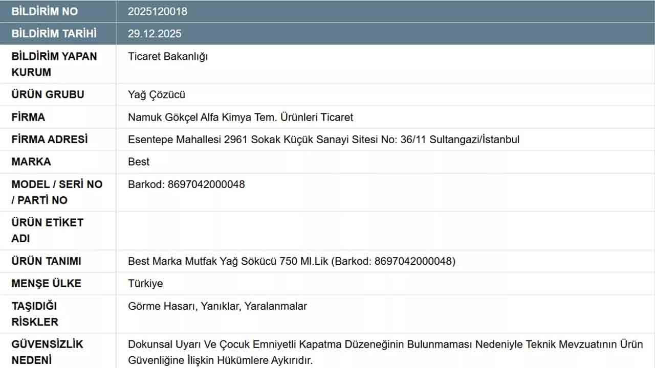 Bakanlığın Güvensiz Ürün Bilgi Sistemi üzerinden yaptığı uyarıda, Best markalı temizlik ürününün kullanımının sağlıksız ve güvensiz olduğunu tespit etti. Ürünle ilgili yapılan açıklamada, görme bozukluğu, yanık ve yaralanmalara neden olabileceği vurgulandı.