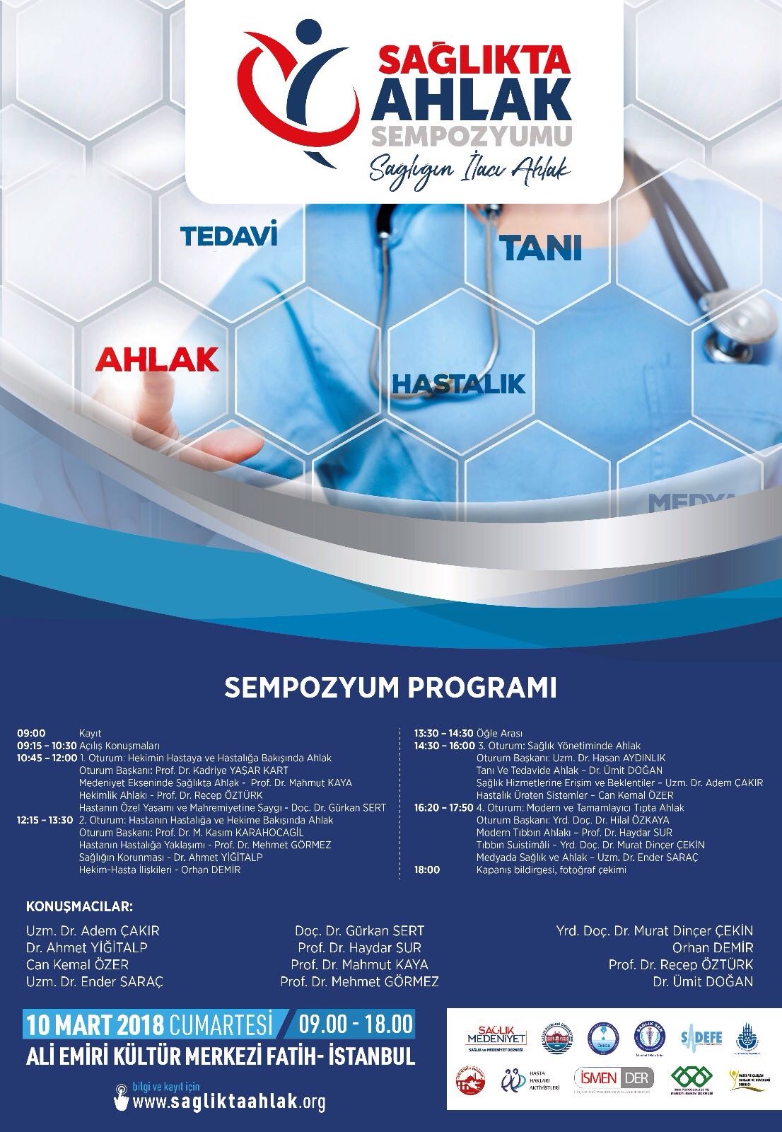 İstanbul Fatih'te "Sağlığın ilacı ahlak" sloganıyla Sağlıkta Ahlak Sempozyumu düzenlenecek. Sempozyum Ali Emiri Kültür Merkezinde 10 Mart 2018'de saat 09:00-18:00 arası gerçekleştirilecek.